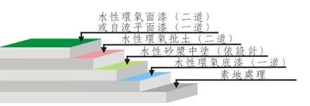 ⑤水性環氧面漆:用滾涂型水性環氧面漆二道,或鏝面型水性環氧面漆一道,完工后光澤柔和、顏色均一;